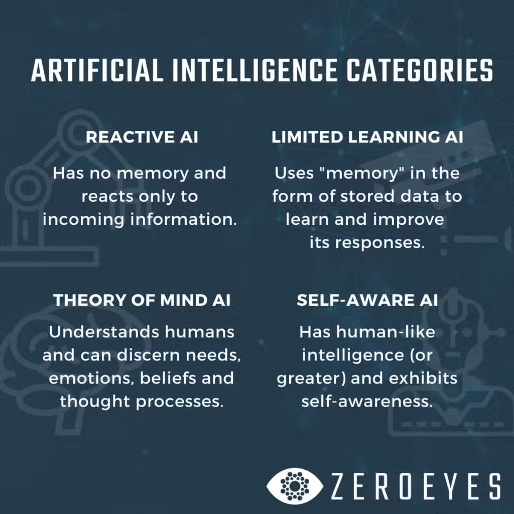 Artificial intelligence is divided into four categories: Reactive Machines, Limited Memory, Theory of Mind and Self-Aware. Let’s define these types of AI.
